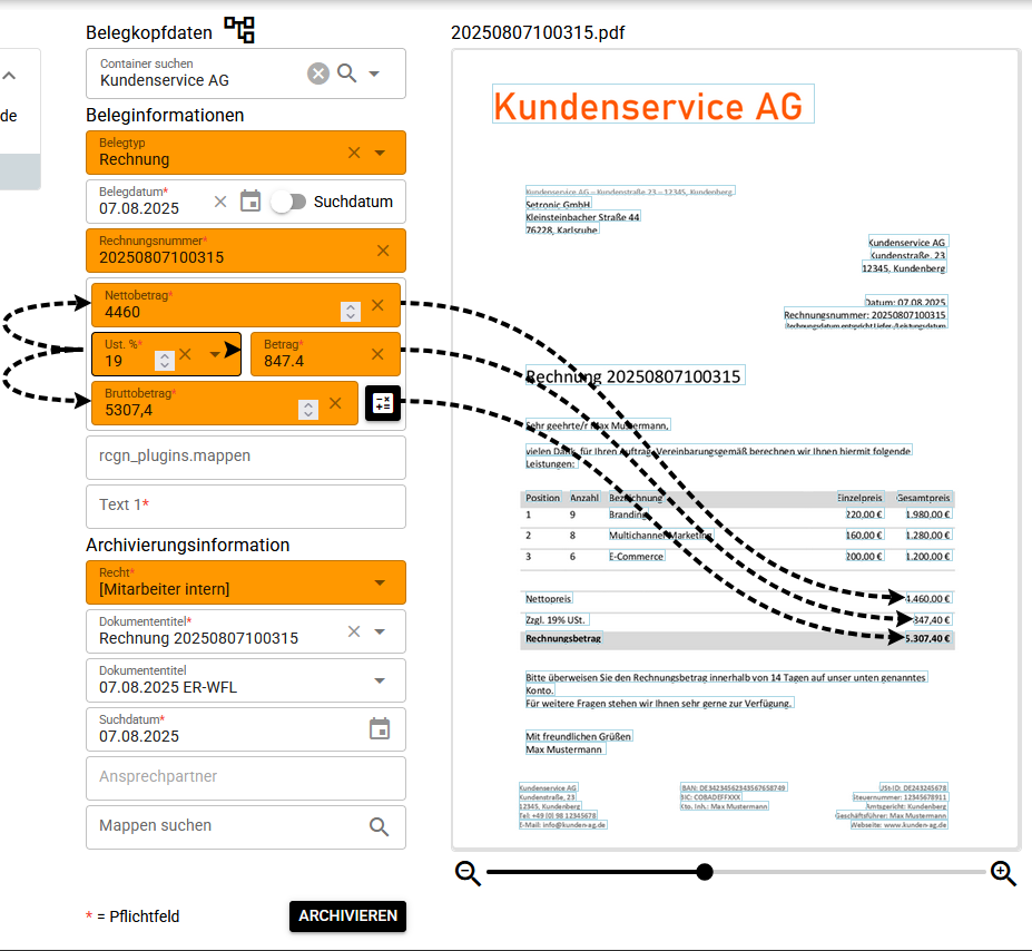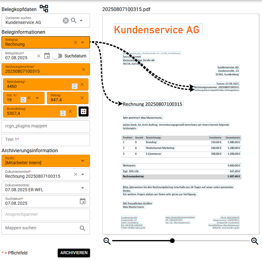 - Erkennen relevanter Metadaten wie Belegnummer, Belegdatum, Brutto-/Netto-Beträge uvm.